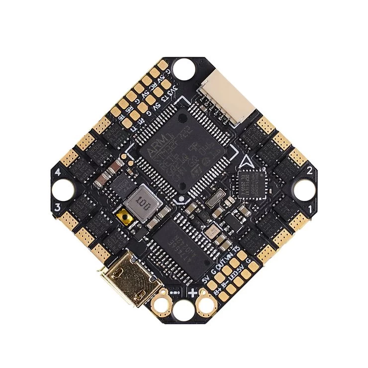 - Eingebauter STM32F722RET6 CPU: Der F722 FC ist leistungsstĂ€rker als der F4 und zeichnet sich durch eine schnelle Verarbeitungsgeschwindigkeit und stabile Leistung aus, die einen zuverlĂ€ssigen und ruhigen Flug fĂŒr 4″-5″ Drohnen ermöglicht.