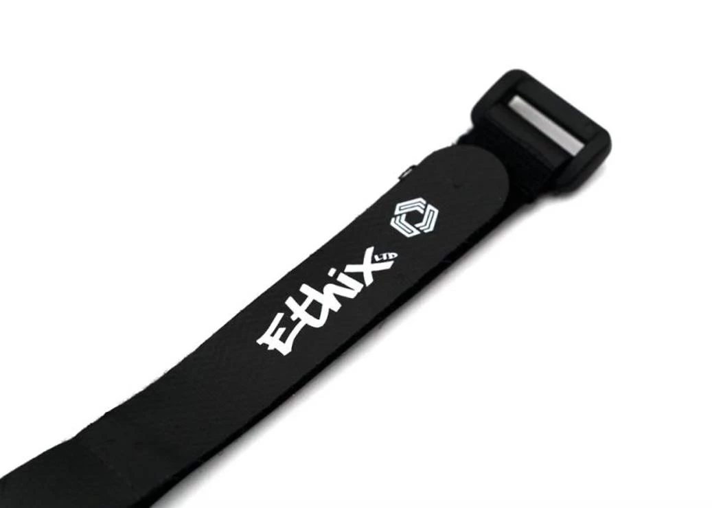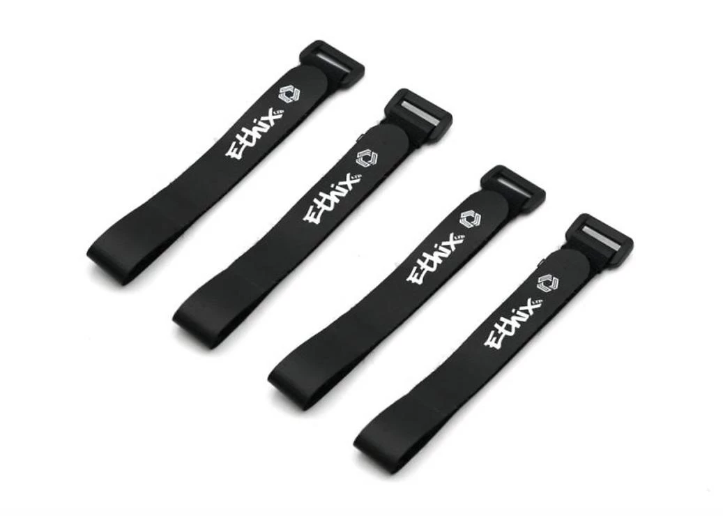 * Wir empfehlen, dieses Band in Verbindung mit unserem 20×250 mm großen Ethix-Lipo-Band zu verwenden. (250 mm vorne und 230 mm hinten. Diese beiden Bänder bieten zusätzlichen Halt, wobei vorne noch eine gewisse Länge zur Verfügung steht, damit Ihre Stromkabel nicht in die Propeller gelangen können.