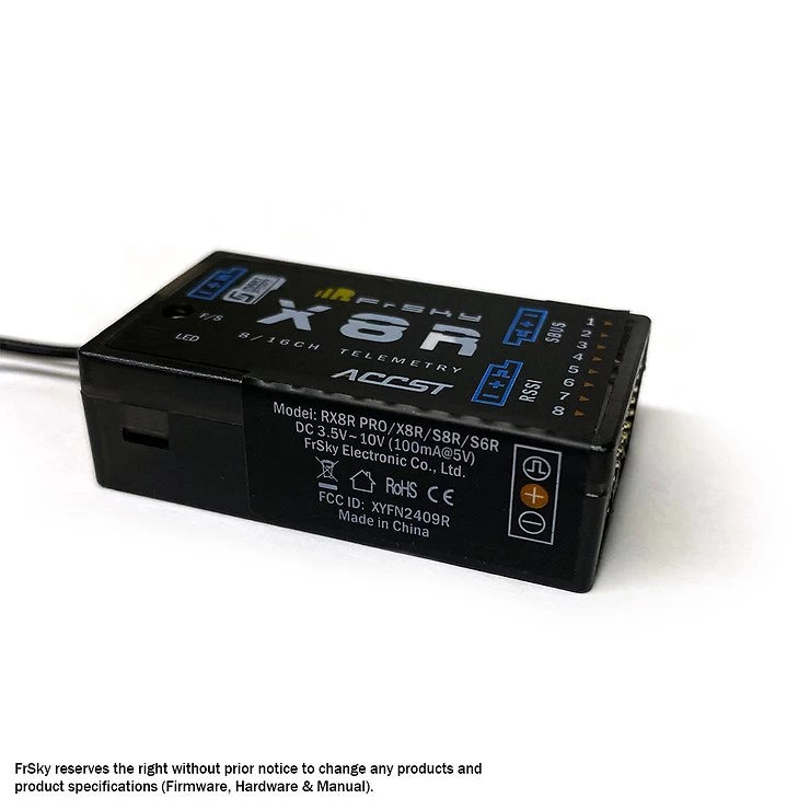 Der X8R hat ein kleineres GehĂ€use als frĂŒhere 8-Kanal-EmpfĂ€nger, bietet aber viel mehr Möglichkeiten. Der X8R unterstĂŒtzt 8 Standard-ServoausgĂ€nge und Sie können auf alle 16 KanĂ€le zugreifen, indem Sie die Sbus-Leitung mit Sbus-unterstĂŒtzten Servos verwenden oder einen FrSky S.BUS Decoder fĂŒr die vollen 16 KanĂ€le verwenden. Sie können 2 X8R-EmpfĂ€nger in Kombination verwenden und die KanĂ€le 1-8 auf dem ersten und 9-16 auf dem zweiten synchronisieren. Das X8-Protokoll ist auch abwĂ€rtskompatibel! Im D8-Modus funktioniert es mit den DHT-, DJT-, DFT- und DHT-U-Sendemodulen.